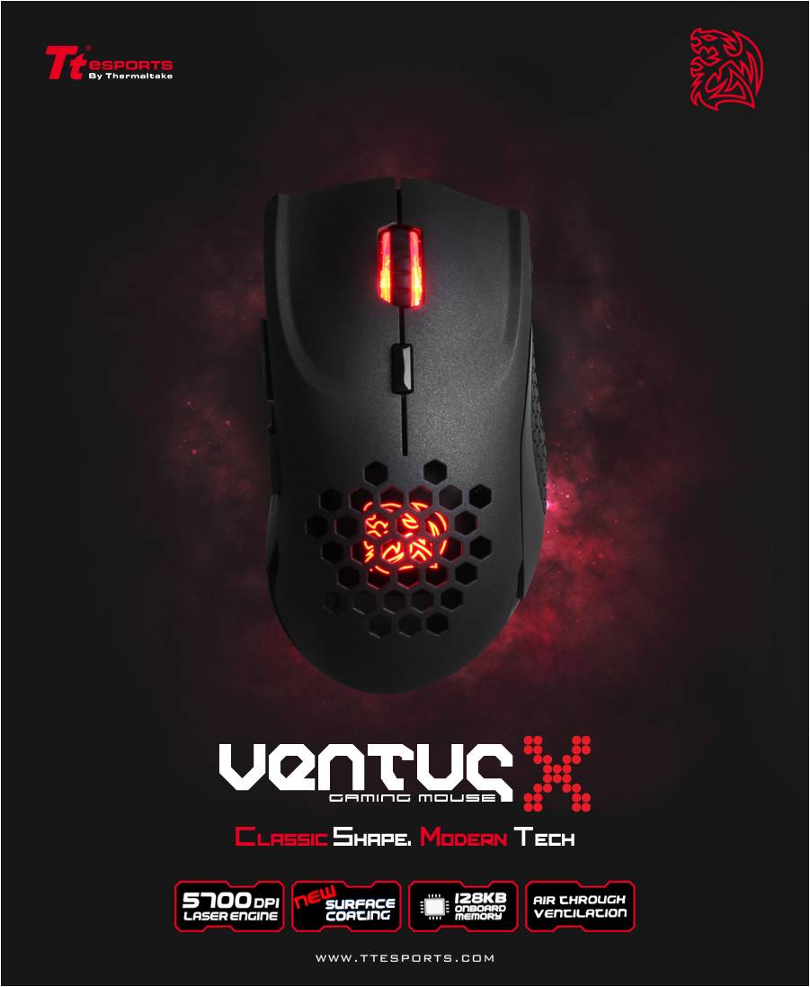 벤투스X(VENTUS X) 마우스는 휠 버튼과 티티이스포츠의 로고인 배틀 드래곤(Battle Dragon)에 붉은색 LED를 적용해 블랙의 세련된 본체를 더욱 돋보이게 하며, 500만번 이상 수명의 높은 신뢰도를 보여주는 옴론스위치와 5700DPI의 아바고(Avago)센서를 사용, 게이밍 마우스의 기본에 충실하다.