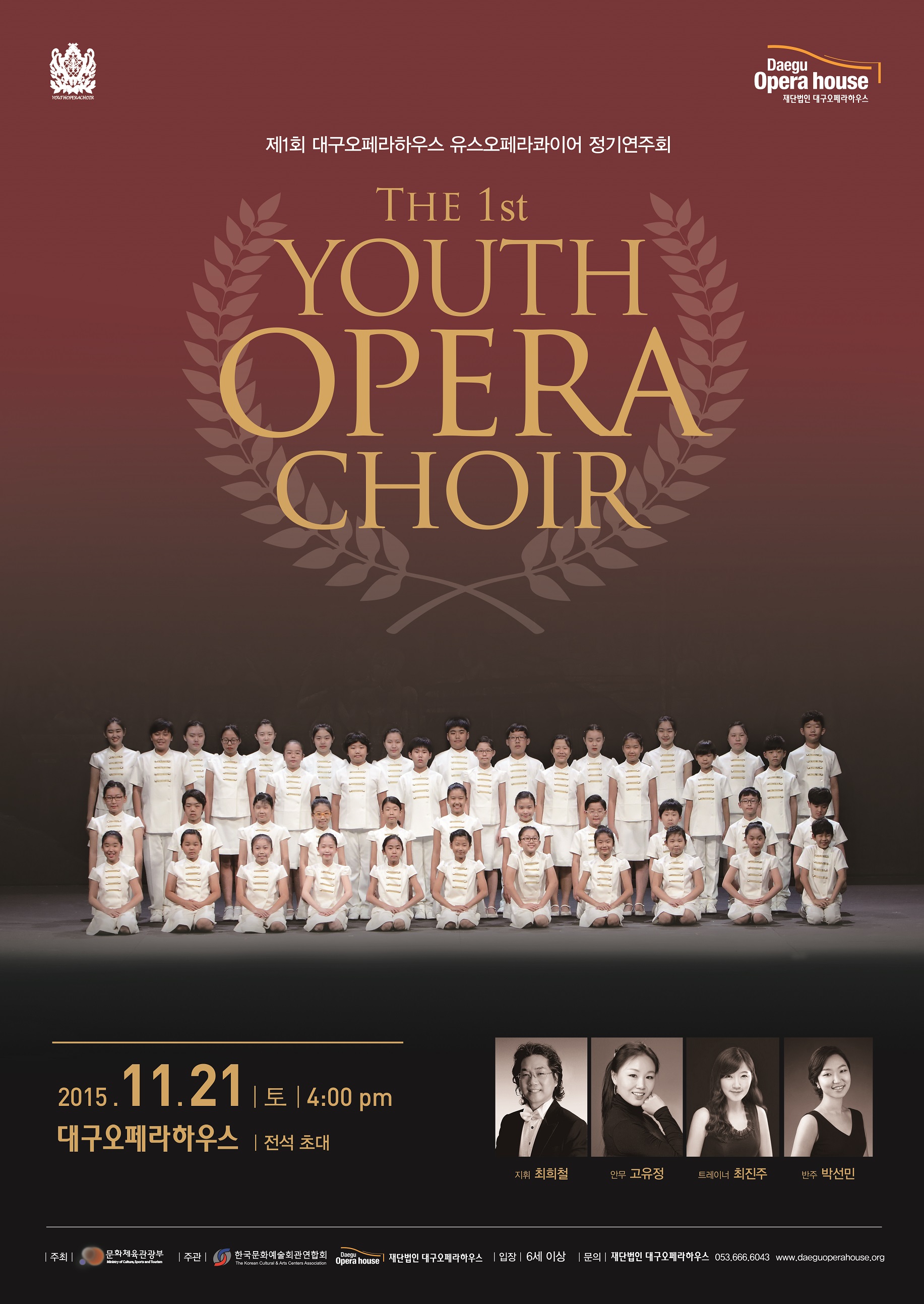 대구오페라하우스가 2015년 창단한 유소년 및 청소년 합창단 ‘유스오페라콰이어’는 초등학생부터 고등학생까지 엄정한 오디션을 통해 선발한 44명의 단원으로 구성되어있으며, 클래식과 뮤지컬은 물론 오페라 속 유명 아리아와 합창곡까지 폭 넓은 레퍼토리를 다룬다는 점에서 기존 유소년 합창단들과는 차별화된다. ‘유스오페라콰이어’ 단원들은 대구오페라하우스 기획공연에 출연하기도 하고, 특히 창단 첫 해인 올해 대구국제오페라축제 창작오페라 <가락국기> 무대로 데뷔하는 등 오페라 전문 합창단으로 성장하기 위한 남다른 경력을 쌓아가고 있다.